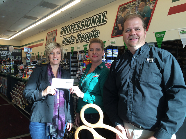 As part of its grand opening festivities Friday and Saturday, O’Reilly Auto Parts donated $200 to St. Jude’s Ranch for Children. Evelyn Kovacevich, left, development specialist for St. Jude’s, accepts the donation from Corinne Koster, store manager, and Brian Pierson, district manager.