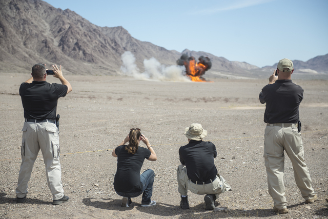 Members of local law enforcement watch an explosion during the grand opening ceremony of the Eldorado Valley Regional Public Safety Training Facility in Boulder City recently. The facility sits on 240 acres of land donated by Boulder City. Henderson set aside $1 million to supplement $1.45 million in federal grants and appropriations secured by Sen. Harry Reid and the Nevada delegation. The facility contains firearm ranges with classrooms, an emergency vehicle course and an explosives and demolition range. Reid and Rep. Dina Titus attended the opening.