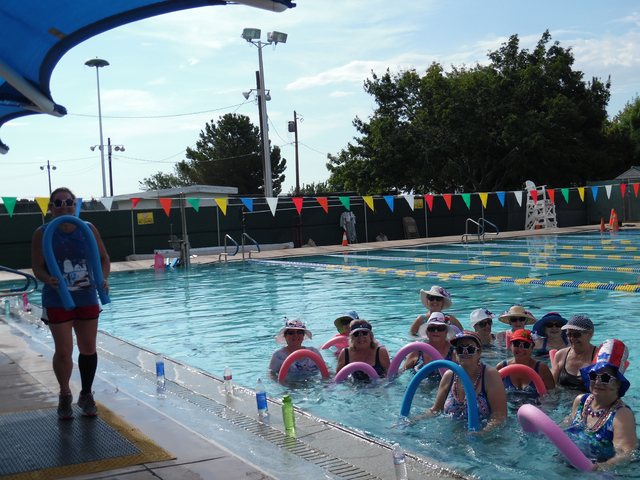 Cheree Brennan, left, teaches the 8 a.m. water aerobics class at the Boulder City pool Thursday. The women in the class dressed in patriotic attire at the request of Julie Morrissett, center with glasses and blue pool noodle, to pay tribute to her late husband, Richard Morrissett, who died March 17. He was a veteran and very patriotic.