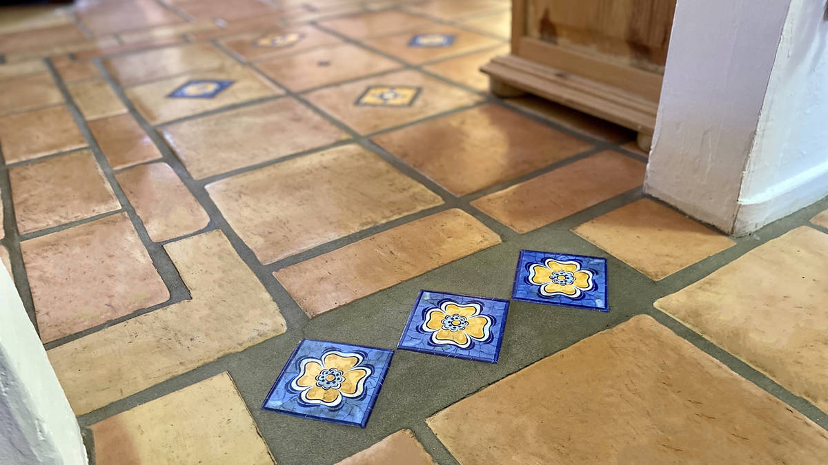 Personalized artwork on bare new tile needs to be protected from foot traffic.