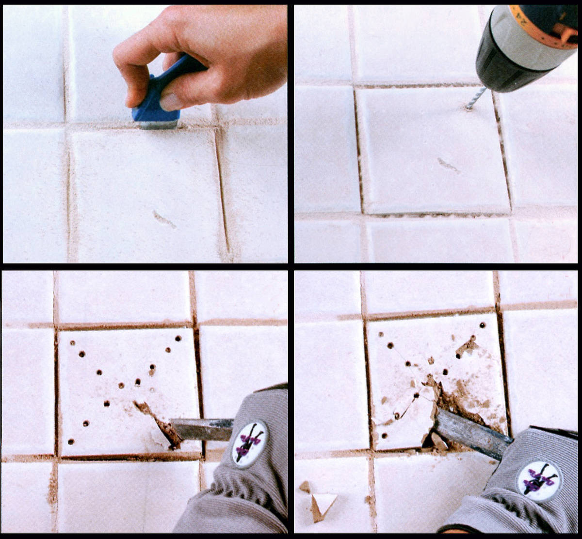 ■ Punch small divots in a big X across the face of the tile with a nail set and hammer. At divot points, drill through the tile (but not through the substrate) to weaken it and create break points. Break out the tile in small pieces with a hammer and chisel.