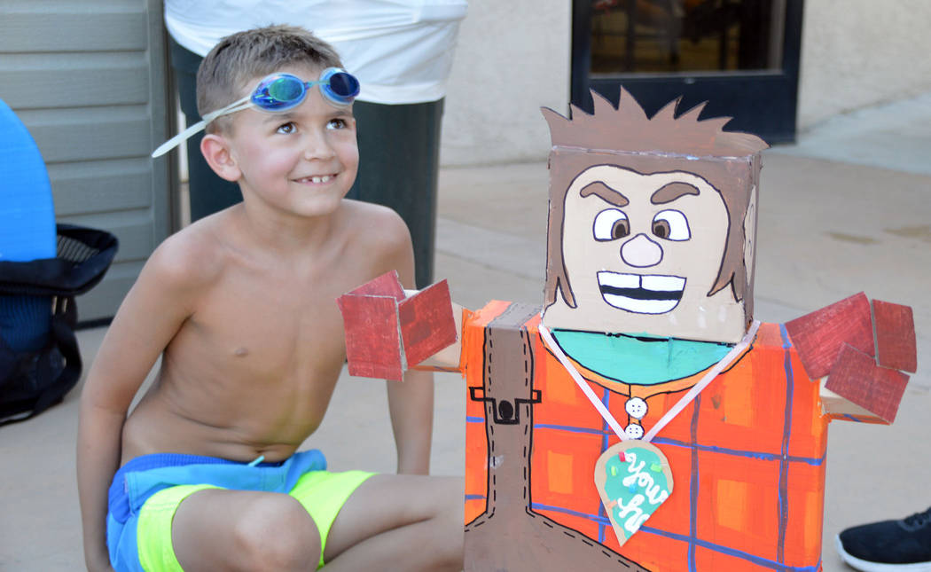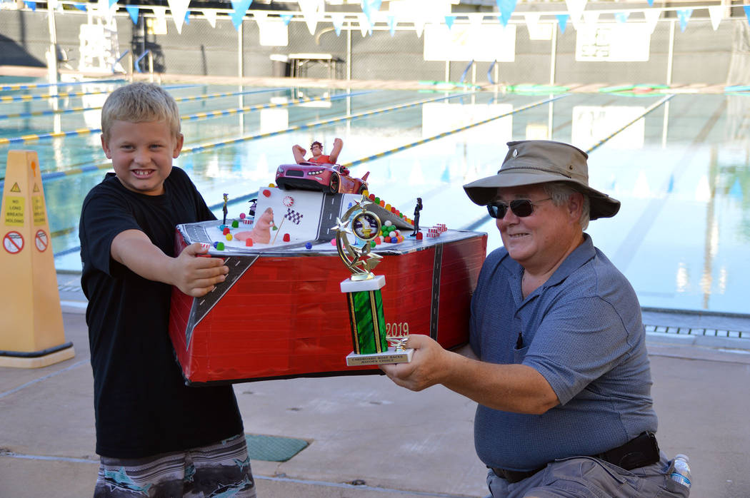 Carson Conway, left, receives the mayor’s choice award for his cardboard boat, Candy Crush Raceway, at the Boulder City Pool’s 19th annual cardboard boat races on Wednesday, July 17.
