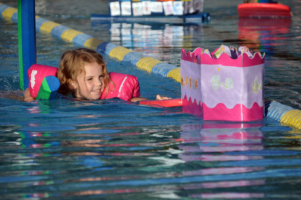 Four-year-old Kinsley Irwin races her boat, U.S.S. Rapunzel, in the 19th annual cardboard boat races on Wednesday, July 17, at the Boulder City Pool.