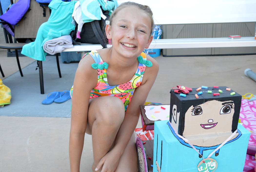 Makenzie Martorano pauses for a photo with her boat, Vanilla Pea, during the cardboard boat races , at the Boulder City Pool.
