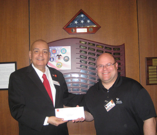 Coach Pete Amaya, left, vice president and manager of the Boulder City branch of Wells Fargo bank, presented a donation to Mark McBride, executive director of the Nevada State Veterans Home for the Nevada Veterans Assistance League. The donation came from the bank, Wells Fargo & Co. and the Wells Fargo Foundation of Nevada as a way to support veterans in the community.