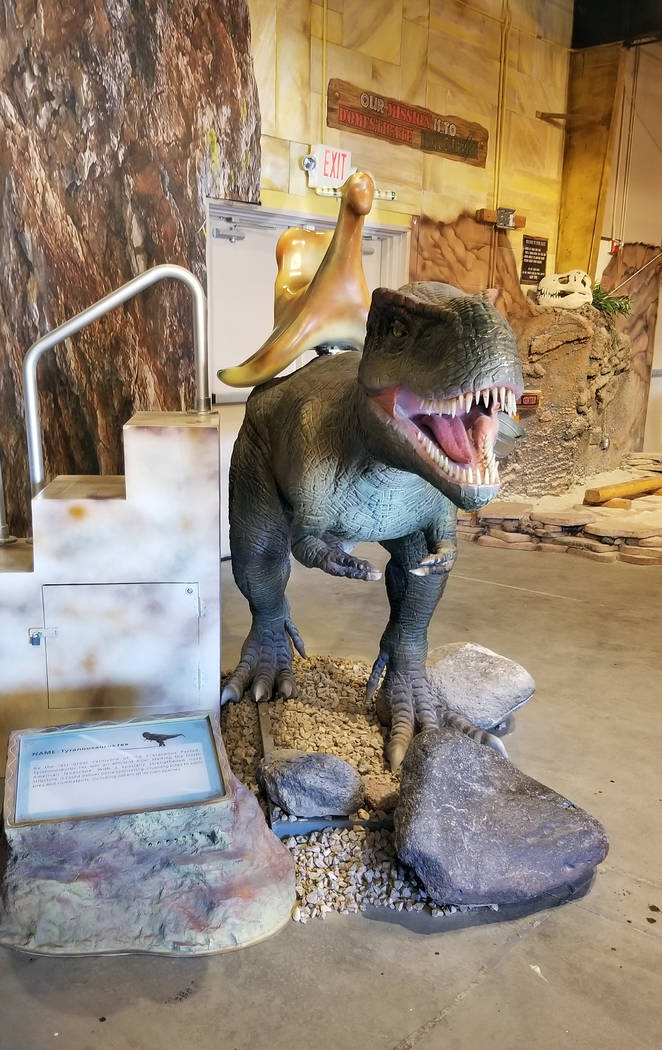 Employee Robert Kern III said Sophie, a triceratops, and TJ, a tyrannosaurus rex, are available for children and adults to ride. Sophie roars while she walks around, and TJ stays in one place but moves his head, arms and tail up and down.