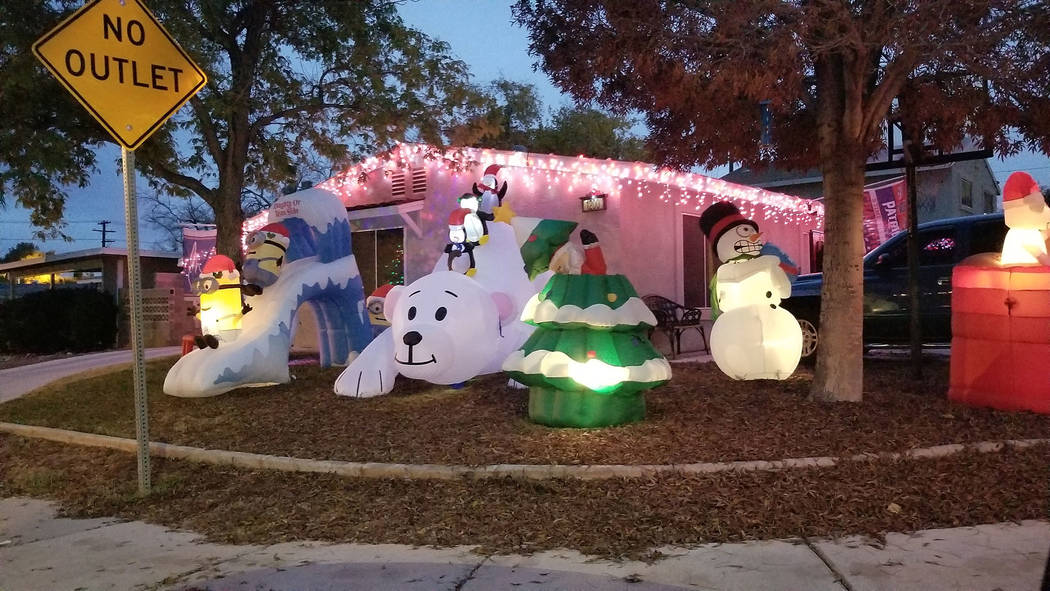 The Christmas display fills the yard at this house with lights, faux snow and holiday characters. Highlights include white and multicolored lights on the house and a sled track with polar bears.