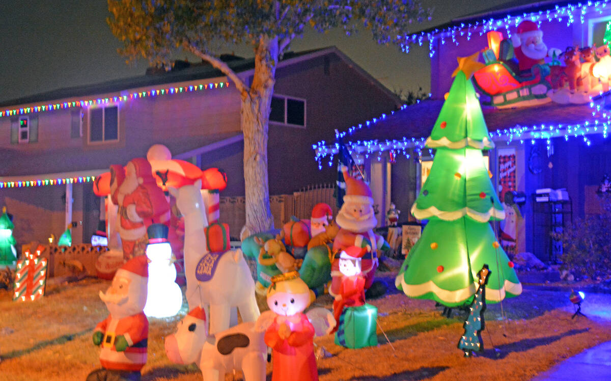 This home in the 1400 block of Bronco Road has inflatable decorations of Santa Claus, reindeer and other animals to help celebrate the holidays.