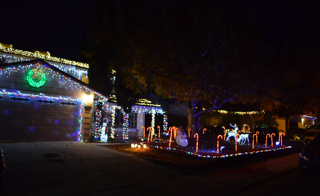 This stretch of neighborhood has more traditional lights and Christmas decorations with candy canes, Christmas trees and animals.