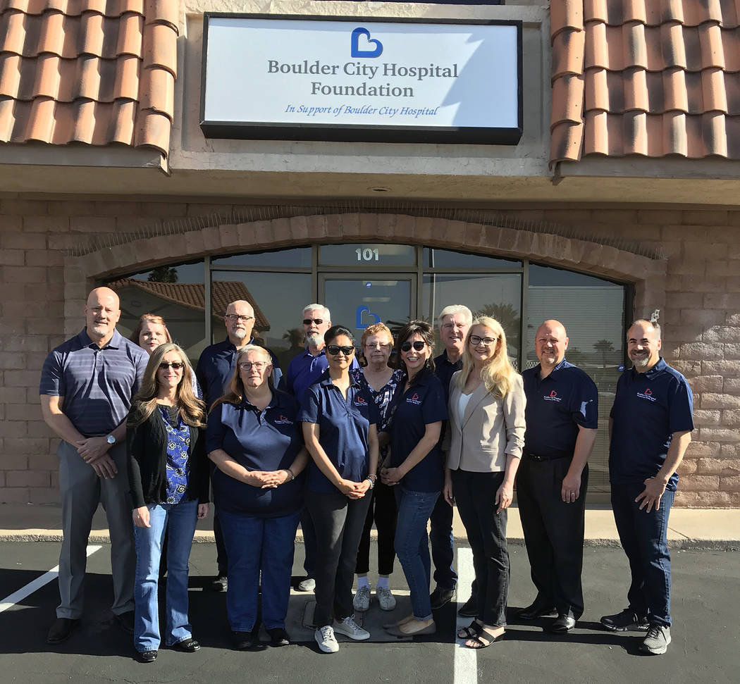 Boulder City Hospital was presented with a $1,000 donation from Copper Mountain Solar. It will be added to money raised at Saturday’s Heart of the Community Gala to help buy a new radiology software system called NovaRad, digital imaging equipment for image production and distribution so that images can be sent remotely to radiologists anywhere for reading. Attending the donation presentation were, back row, from left, Tom Maher, CEO; Wendy Adams, Scott Hinson, Alan Bowman, Aimee Fraser, Doug Lewis, Wendell Whitman and Bret Runion; front row, from left, Rae Cummings, Andre Pastian, Sue Manteris, Rebecca Ricksecker and Susan Melton of Copper Mountain Solar.