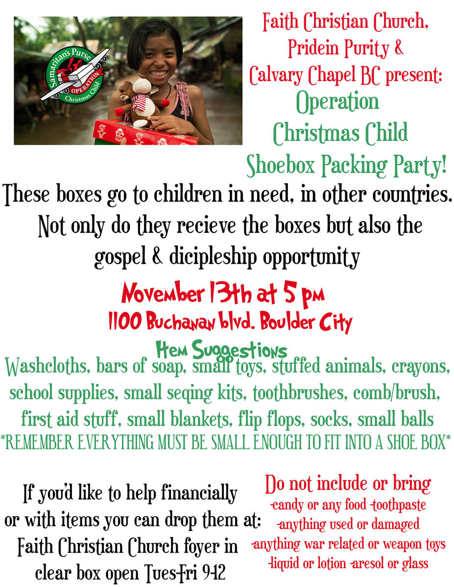 She said this year the goal is to collect 700 boxes. For those who want to participate, there is a packing party at 5 p.m. Friday, Nov. 13, at the church. It is co-sponsored by Calvary Chapel Boulder City and Pride in Purity.