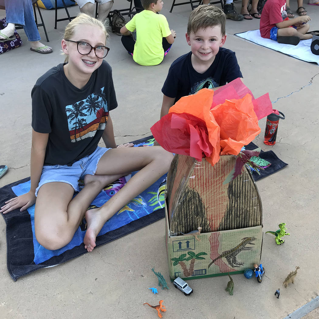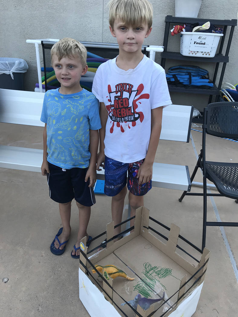 Brothers Quinlan, 5, and Brendan Smith, 8, presented the Dino Cave for the 18th annual cardboard boat races on July 25.