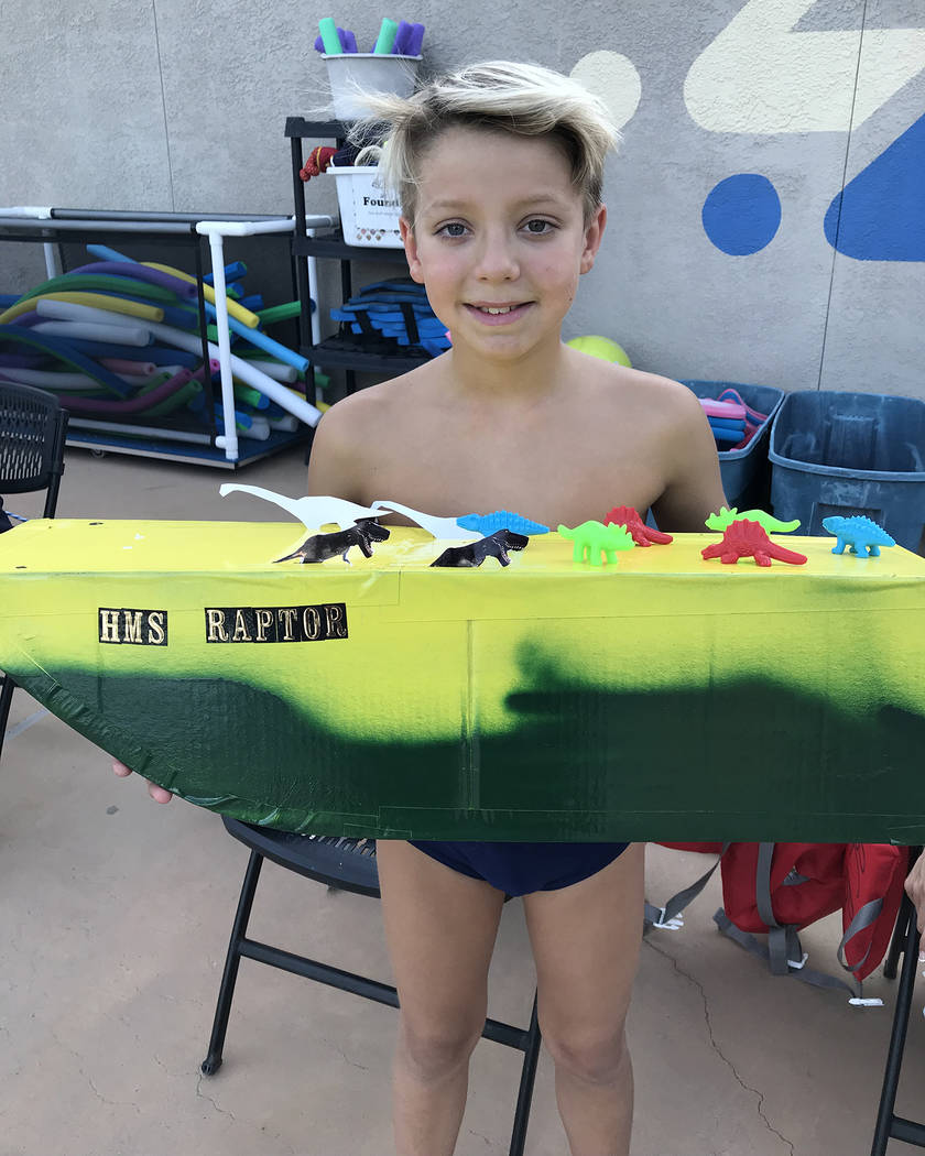 Canyon Lenon, 10, entered the HMS Raptor in the 18th annual cardboard boat races at Boulder City Pool on July 25. His boat came in second place in the most original category, and he places first in his swimming heat.