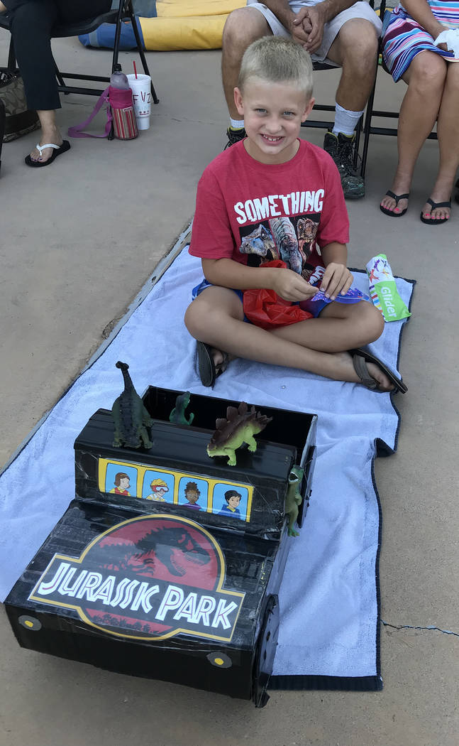 Carson Conway, 7, shows off his Jurassic Jeep entry for the 18th annual cardboard boat races at the Boulder City Pool on July 25. It won third place for most original entry.