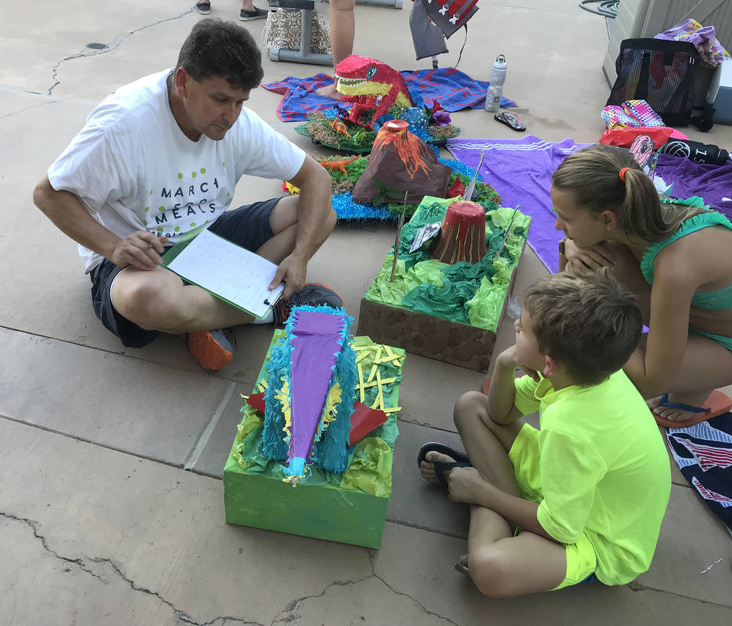 Mayor Rod Woodbury talks to Michael and Makenzie Martorano about their entries while judging the 18th annual cardboard boat races at the Boulder City Pool on July 25.