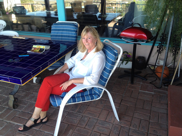 Sally Denton sits in her backyard overlooking the entirety of Boulder City. Her glasses sit on the patio table right next to the book she just put down.