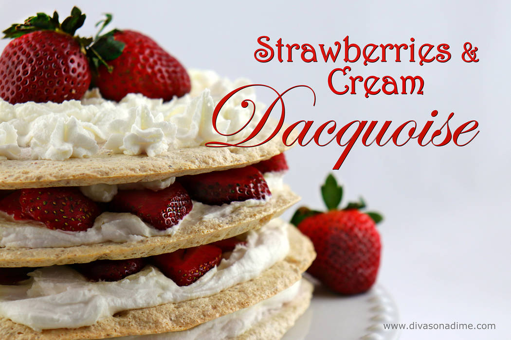 To assemble: Whip the heavy cream with the sugar to soft peaks. Add the mascarpone, if using, and blend. The mascarpone adds thickness making it more stable. Layer the dacquoise with cream and sliced berries.