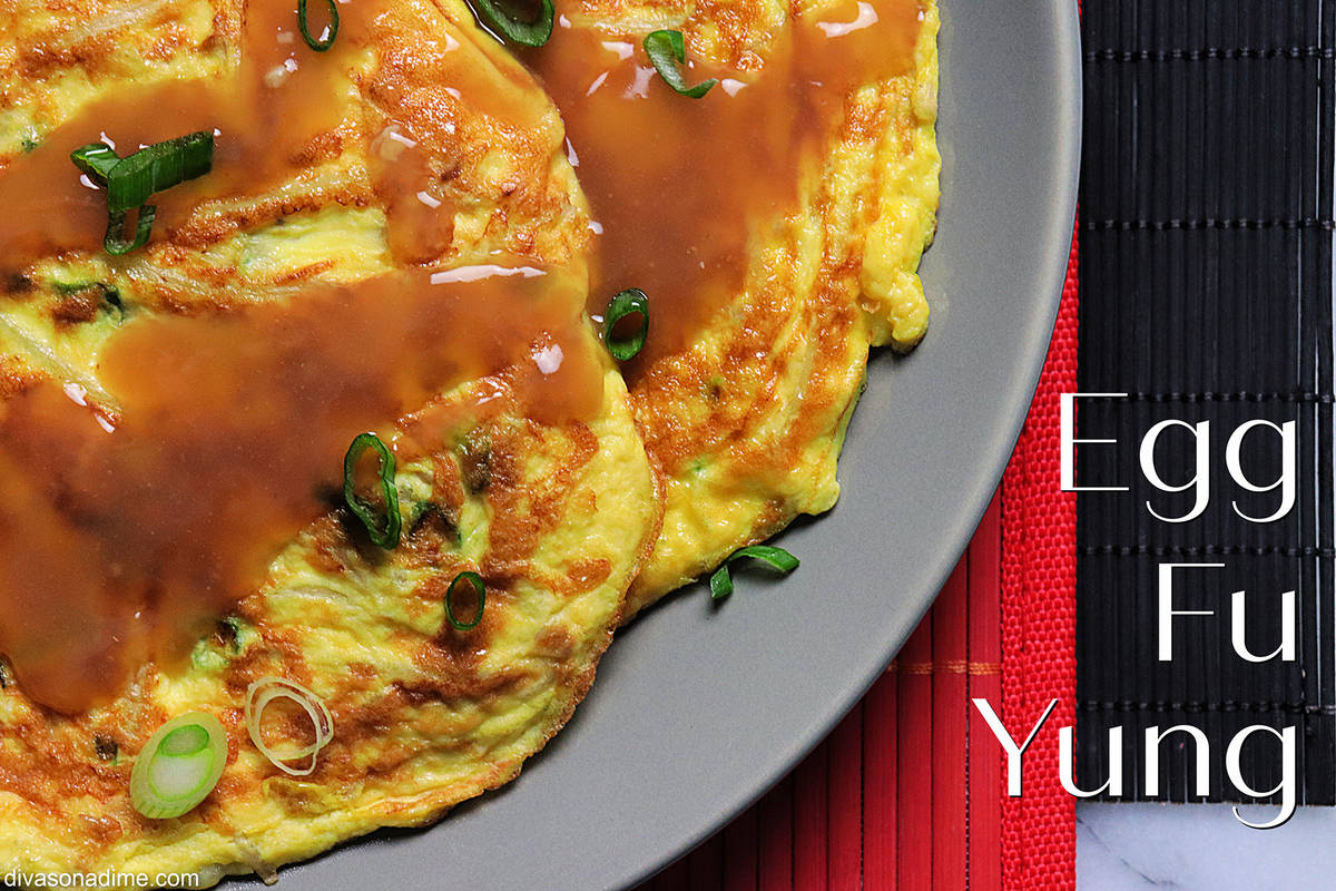 Serve topped with the egg fu yung sauce, garnished with green onion.