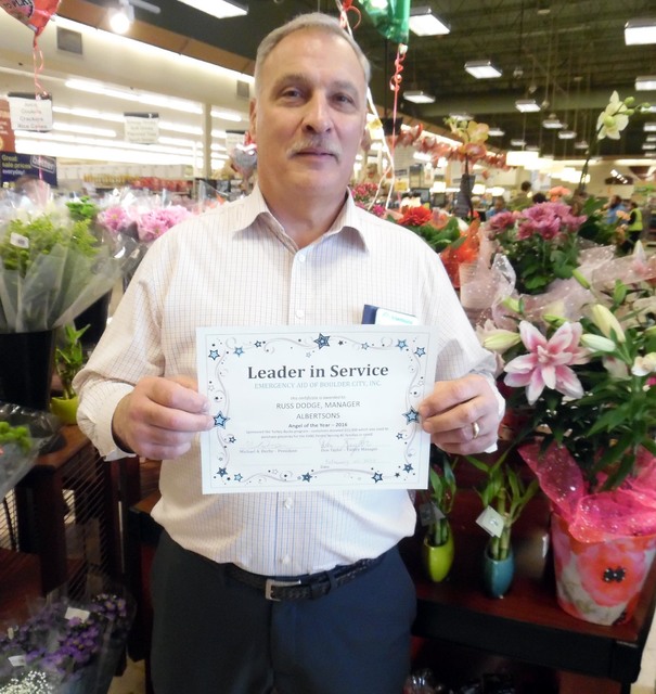 Albertsons manager Russell Dodge was caught by surprise when members of Emergency Aid of Boulder City presented him with a cake and a certificate honoring him as the nonprofit’s Angel of the Year for 2016.
