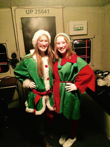Amber Oliver and Tara Spinkelink, members of the girls basketball team at Boulder City High School, were among those who volunteered to serve as elves on the Santa Train at the Nevada State Railroad Museum this year. The girls volunteered as pairs, with each set providing seven hours of time to listen to Christmas wishes and help entertain the riders. Team members volunteer with other events throughout the year, including Boulder City Sunrise Rotary Club’s annual Wurstfest.