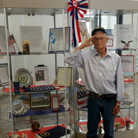 The display includes items such as a copy of the U.S. Constitution, historical plates, information about John Adams, Thomas Jefferson and George Washington, and flags.
