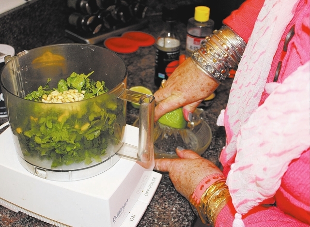 Meanwhile, combine cilantro, pine nuts, lime juice, soy sauce, sesame oil, sugar, ¼ cup olive oil, salt and pepper in a food processor and blend until bright green and smooth. About one minute.