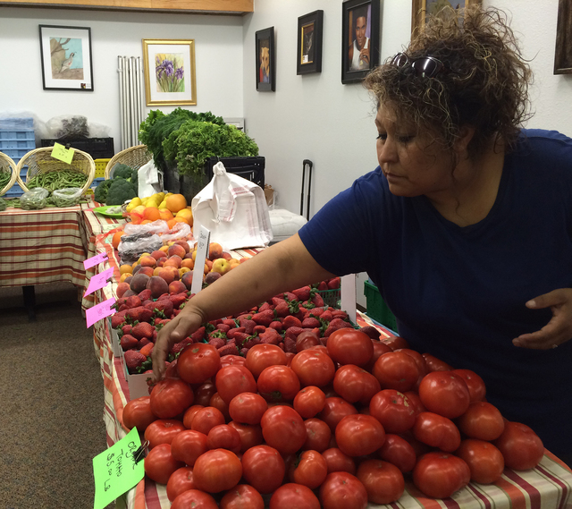 Beatrice Salazar of DD Enterprise Ventures puts out fresh, organic tomatoes at The Green Chefs’ farmers market inside the Senior Center of Boulder City on Friday. The market will return each Friday from 8 a.m. to noon until December.