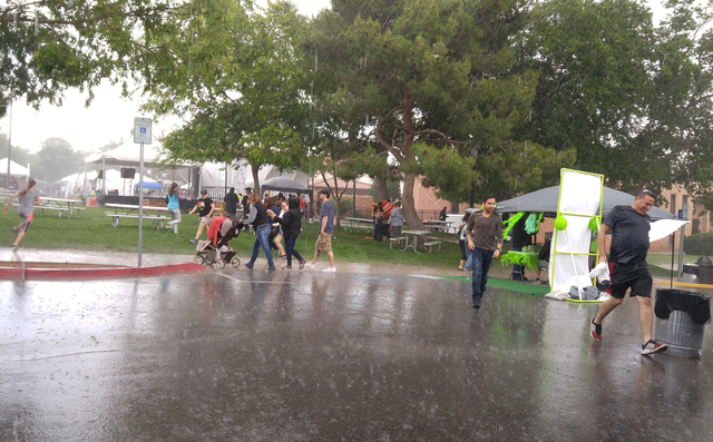 “The rain ain’t sending us home,” said Chris Kemp, as his 5-year-old son Gavin Kemp excitedly agreed. The two recently moved to Boulder City from North Dakota and said they thought the weather still a great change from the cold climate they were used to.
