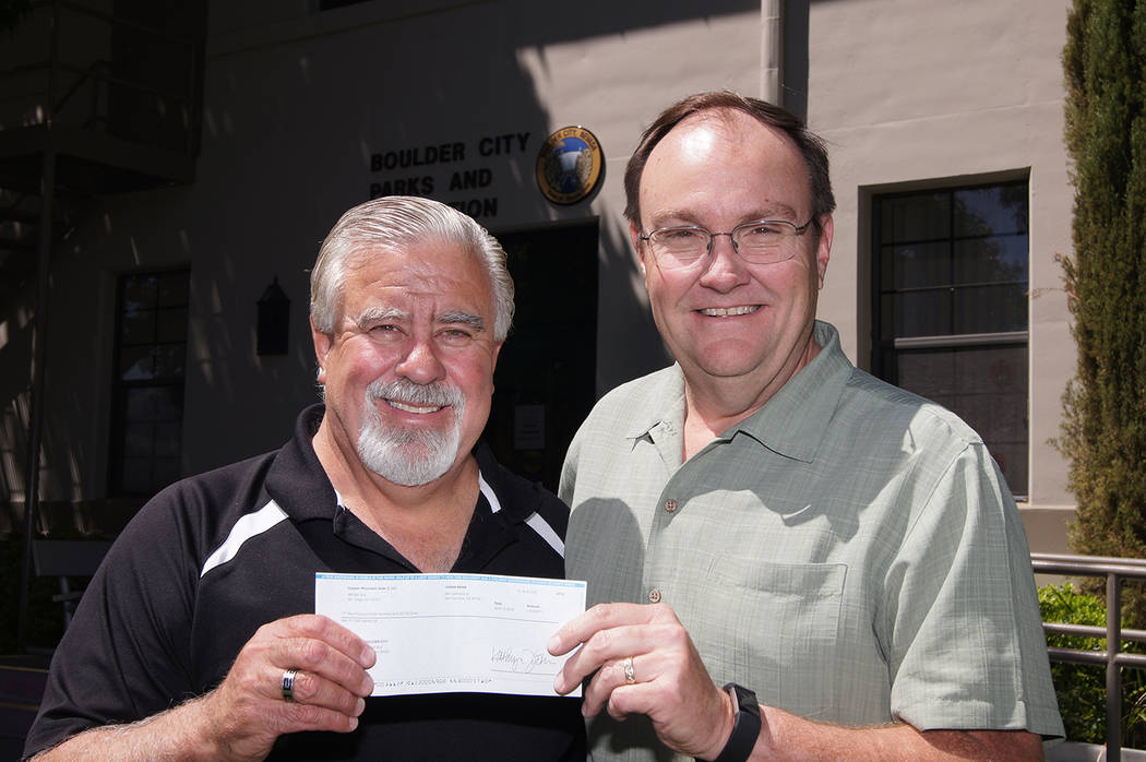 Justin Hawkins, left, operations and maintenance manager for Copper Mountain Solar, Sempra Renewables, presents a $1,500 check to Roger Hall, parks and recreation director for Boulder City. The donation will help fund the all-day 4th of July Damboree celebration.