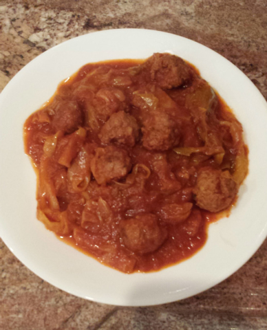 Place a cooked whole cabbage leaf onto a plate and spoon the meatballs and cabbage on top.