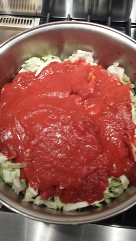 Cut each head of cabbage in half and core. Slice the cabbage half into ¼-inch slices. Separate the layers as you put the cabbage into the pot over the meatballs. Once the first head is in the pot, cover it with the remaining sauce from the first jar, along with half of the second jar. Shake a small amount of water in each jar to get all the sauce out, being careful not to make it too watery.