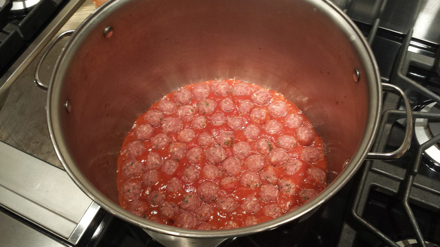 Cover and cook over a low- to medium-low heat. After 45 minutes, stir everything in the pot until it is covered with sauce and the meatballs are off the bottom of the pot.