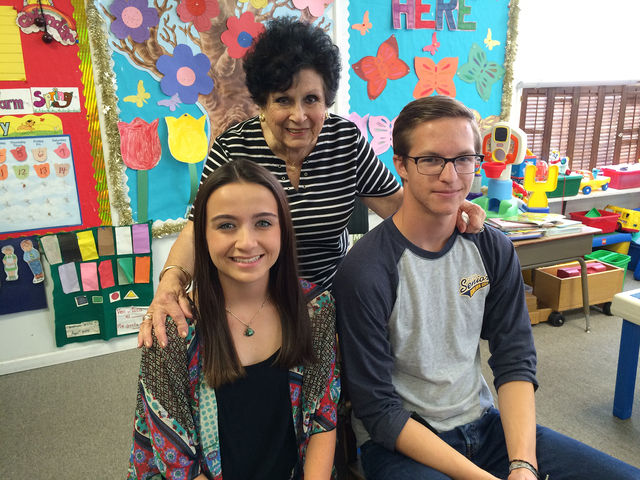 Oaklane Preschool Founder and Director Carole Gordon, center, congratulates Kellie Corona and Kevin Vallely, former students, after presenting them with scholarships during Boulder City High School’s annual scholarship night on Monday. Corona will attend Montana State University, where she will have a premed major. Vallely said he plans to major in mechanical engineering at the University of Nevada, Reno, in the fall.