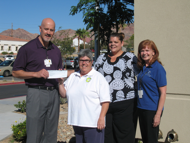The Boulder City Hospital Foundation recently received a $5,600 grant from the Nevada Community Prevention Coalition for training performed by Ellise Hayden, Boulder City Hospital program director, in connection with a program for senior citizens entitled “Managing New Seasons” that was offered in Boulder City, Laughlin and Mesquite. The funds were provided by the Nevada Public and Behavioral Health Department and distributed through the Nevada Statewide Coalition Partnership. Accepting the donation from Rose Ann Miele, second from left, NCPC Boulder City coordinator, are, from left, Tom Maher, CEO and foundation interim board president, Boulder City Hospital; Wendy Adams, community events manager, Boulder City Hospital Foundation; and Hayden.