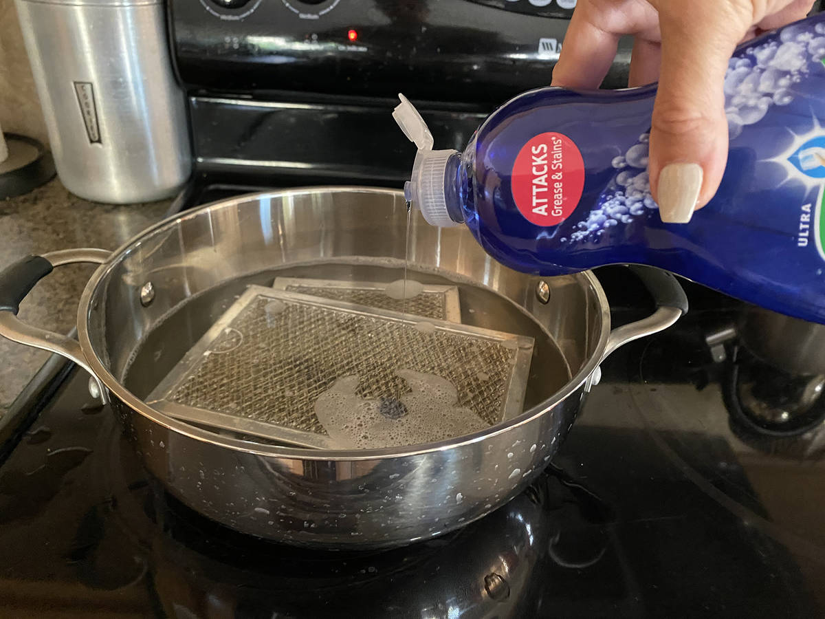 ■ Place greasy metal hood filters in a pot of simmering water with a few squirts detergent and watch the grease melt away.