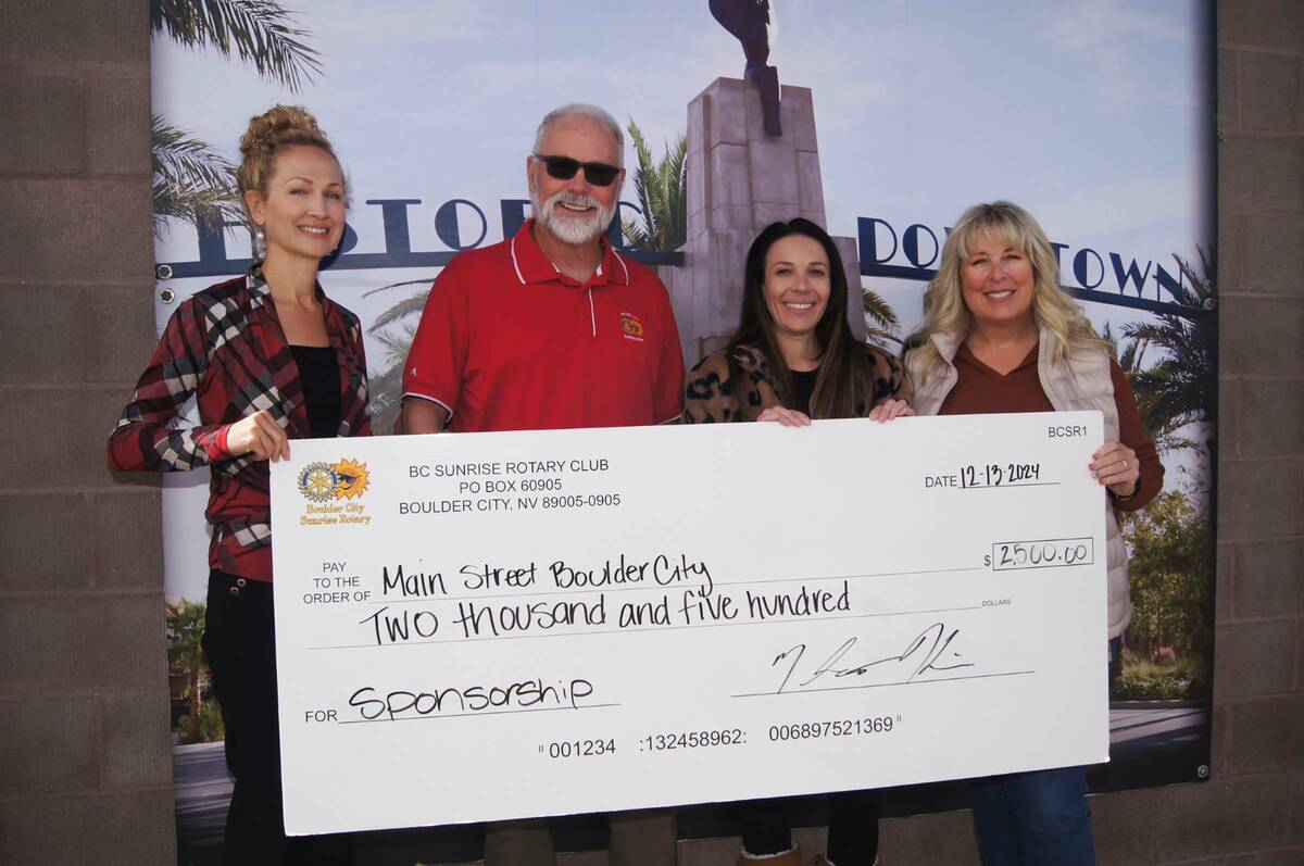 The Boulder City Sunrise Rotary Club recently sponsored the new Main Street Boulder City program and the Chamber of Commerce New Year’s Eve Celebration. Pictured, from left, Main Street Volunteer Amber Cunningham, Sunrise Rotary President Scott Hinson, MSBC volunteer Danielle Stemmer, and MSBC volunteer Michelle Caven. Sunrise Rotary Club also recently presented a sponsorship check to the sports staff of the Parks and Recreation Department for the K-second grade floor hockey program.
