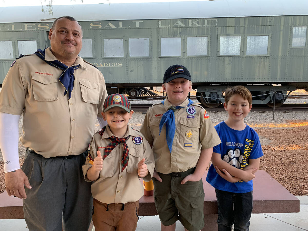 Local Scouts attended Friday’s fundraiser for the Huff family at the Nevada State Railroad Museum in Boulder City to provide assistance and earn community service volunteer time. Among those who helped were, from left, leader Bret Bratton, Carter Bratton, a member of Pack 30; Joseph MacLeod, a member of Troop 7, and their friend Alex Jalvis.