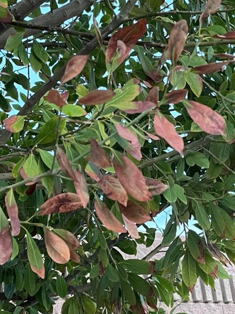 A. From the picture you sent the leaves exposed to the heat of the sun are scorching along the edges. This means not enough water is getting to them either because there is not enough water supplied to the trees or there is damage to the trunk or limbs.