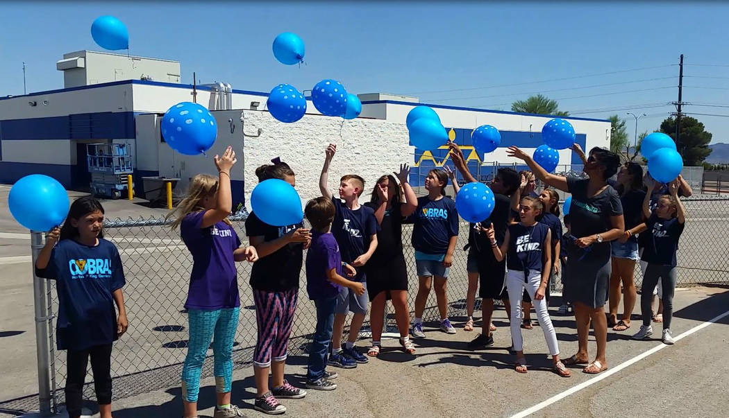 King Elementary students and Manteris family members release balloons on Monday in honor of Michael Manteris, a former King student who died at the end of March from cancer complications. Michael, who loved basketball, was also honored on the court, as the backboards were repainted to include phrases he was known by: Be kind, be courageous and be happy.