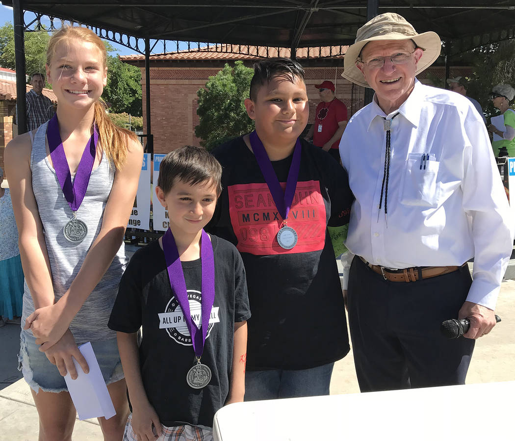 Addison Doane, from left, Dean Barr and Sebastian Herandez, winners of the youth division of the KidsQue contest for children 6-12, are congratulated by Sen. Joe Hardy at the Best Dam Barbecue Challenge on Saturday, May 26, 2018, in Bicentennial Park. They won third, second and first place, respectively.