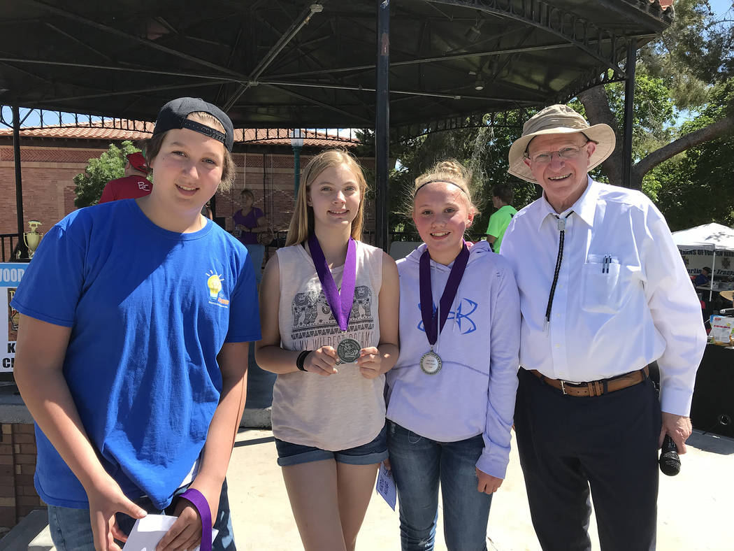 Cameron Johnson, from left, Zoey Curtis and Maddie Miller, winners of the junior division of the KidsQue contest for youths 13-18, are congratulated by Sen. Joe Hardy at the Best Dam Barbecue Challenge in Bicentennial Park on Saturday, May 26, 2018. They won third, second and first place, respectively.