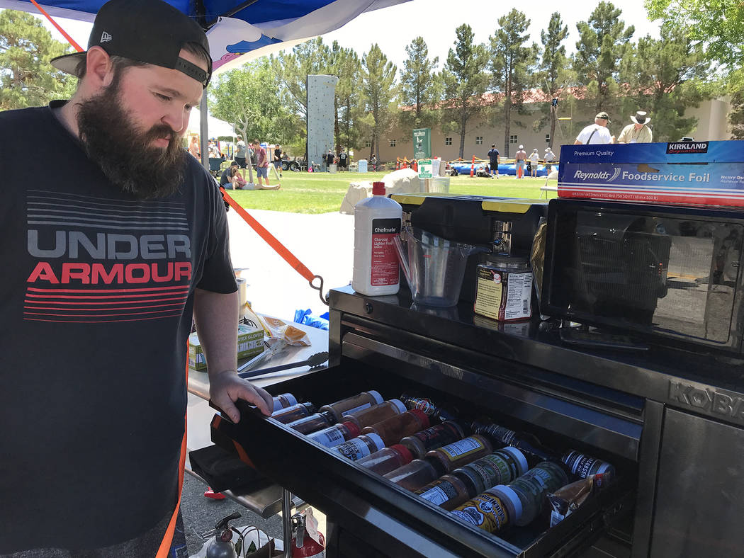 Dave Hanson of Crooked Pig of Boise, Idaho, shows off a tool box he converted into a spice rack at the Best Dam Barbecue Challenge on Saturday, May 26, 2018.