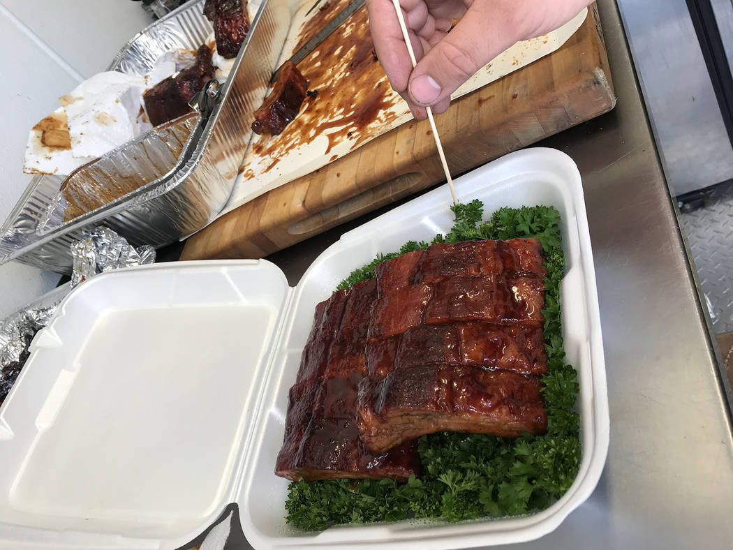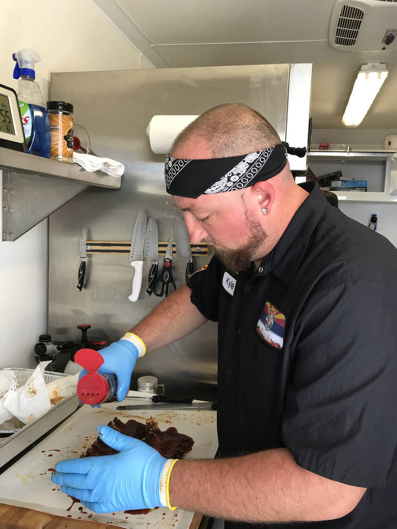 Kyle Matuszewski of Your Behind BBQ of Waddell, Arizona, puts finishing touches on his ribs before turning them into to judges on Saturday, May 26, 2018, at the Best Dam Barbecue Challenge presented by the Rotary Club of Boulder City in Bicentennial Park. He competes with his father, Jerry. Their ribs came in third place.