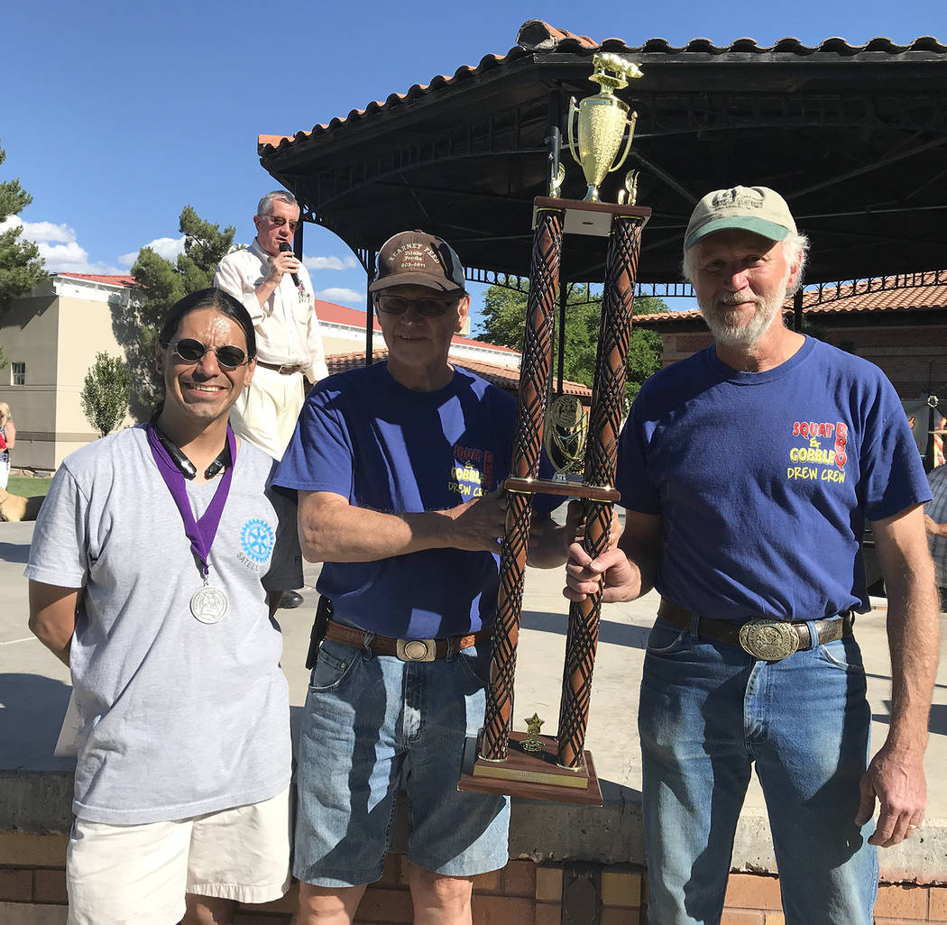Larry Archuleta, left, president of the Rotary Club of Boulder City, congratulates Leon Drew, center and Randy Drew of Squat & Gobble after it was named the champion of the 14th annual Best Dam Barbecue Challenge on Saturday, May 26, 2018.