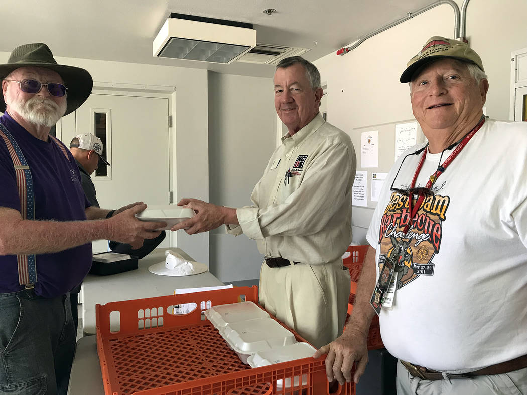 Mike Verner, left, of Infinite Smoke, turns in his brisket entry to Kelly MacIntosh of the Kansas City Barbeque Society, center, and Frank Carroll of the Rotary Club of Boulder City at Saturday’s, May 26, 2018, Best Dam Barbecue Challenge.