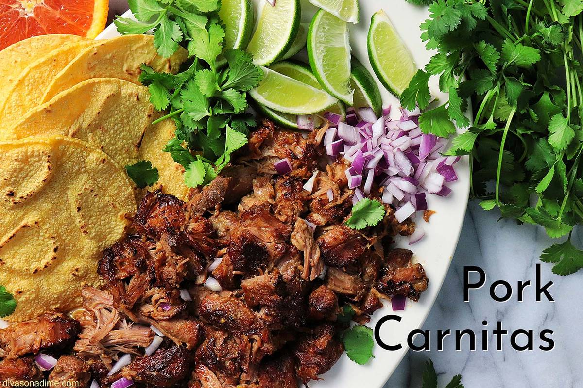 Carnitas means “little meats” in Spanish and is Mexico’s version of pulled pork. This recipe yields restaurant-quality pork at a fraction of restaurant costs. It uses very inexpensive cuts of heavily marbled pork that is slow roasted for hours (or cooked in a pressure cooker, instructions below) until the meat is completely tender. The pork is cooked so well it completely falls apart and practically shreds itself.