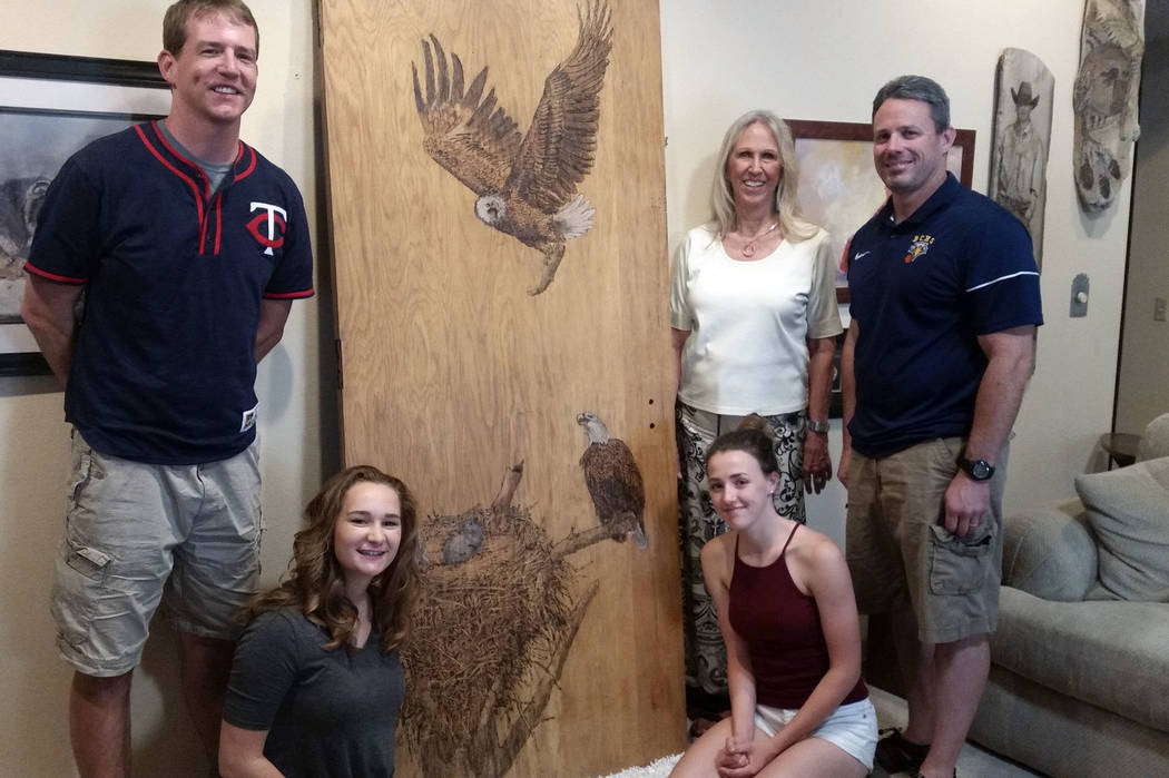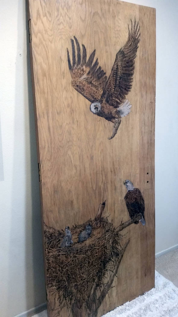 Jordan said the sculpture took six weeks to complete from the time she started sketching. With the exception of some white paint for the eagles’ heads and tails, the picture was created completely with the burning process.