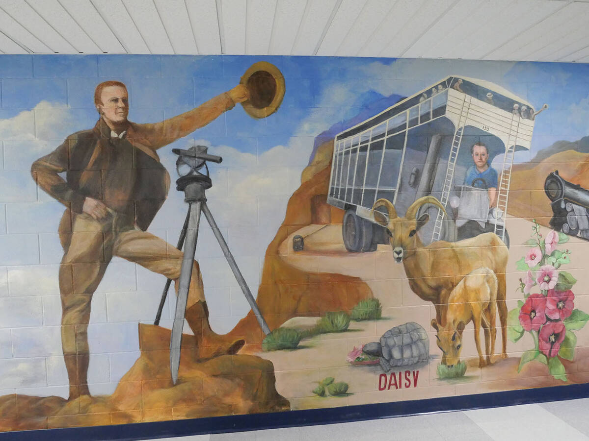 The halls of King Elementary School are now a lot more colorful as a new mural welcomes students and visitors through the office entrance. Done by Boulder City local artist Connie Burnett Ferraro, this mural shows the history of the community and Southern Nevada in general. Things such as the Hoover Dam, bighorn sheep and a TWA plane (which Ferraro says is her favorite) are all present.