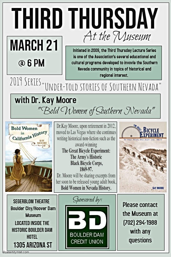 The 2019 series, “Undertold Stories of Southern Nevada,” will start at 6 p.m. March 21 in the Segerblom Theatre inside the Boulder Dam Hotel, 1305 Arizona St. Kay Moore will be presenting “Bold Women of Southern Nevada.” Refreshments will be served.