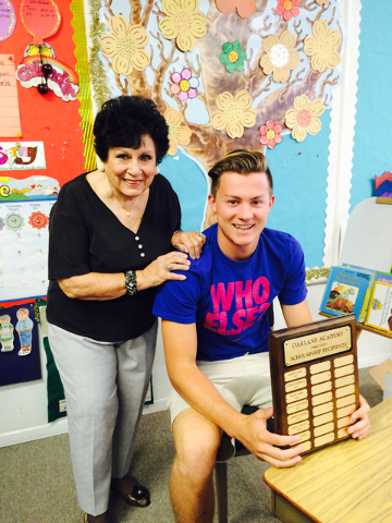 Oaklane Preschool Academy presented a $1,000 scholarship to Brooks Roe during Boulder City High School’s annual Scholarship Night in May. Carole Gordon, owner of Oaklane, congratulates Roe, who attended the academy. He plans to attend Dixie State College, where he will major in mass communications. The former captain of the football, basketball and cross-country teams said he will focus on academics and has no plans to participate in sports at the college. He will spend part of the summer in Fiji on a humanitarian trip.